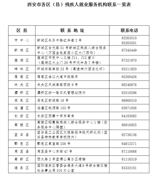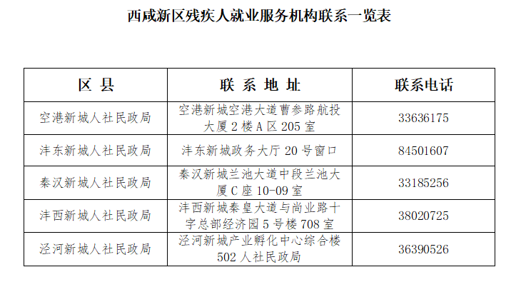 (二)市税务局各区县分局及航天分局、航空分局登记注册的用人单位,在所属行政辖区的区县残疾人劳动就业服务机构认定;高新区税务局登记注册的用人单位在高新区民政局认定; 西咸新区税务局登记注册的用人单位在西咸新区相关机构进行认定。(相关联系方式见附表)