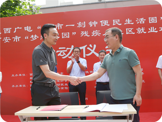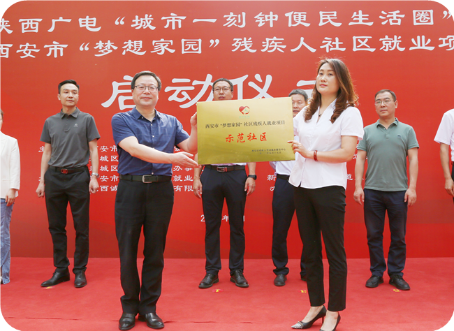 5月21日,由陕西广电网络传媒(集团)股份有限公司发起,由陕西广电华通投资控股有限公司、西安市残疾人联合会、新城区残疾人联合会、新城区韩森寨街道党工委、新城区韩森寨街道办共同主办,西安市残疾人劳动就业服务中心、新城区韩森寨街道东方社区、陕西诚乡社区服务有限公司共同承办的陕西广电“城市一刻钟便民生活圈”暨西安市“梦想家园”残疾人社区就业项目启动仪式在西安市新城区东方社区举行,两名残疾人朋友在社区“家门口”上岗就业。
