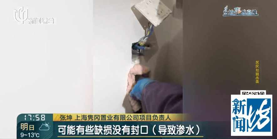上海(hai)隽冈置业(ye)有限(xian)公司项目负责人 张(zhang)坤:应该是前面施工总承包单元在工序上有所缺失,导致(zhi)我们(men)预埋的线盒线管暂且保护步伐可能(neng)有所损坏,在墙体养护的时候,养护水流(liu)入了预埋的线管和(he)线盒内(nei)导致(zhi)了积蓄。通过管理追溯,大概留存有积水是时间有一年左右。