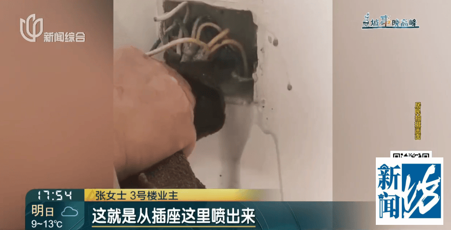 3号楼业(ye)主 张(zhang)女(nu)士:这是我们(men)家的情况(kuang),当时说来排查(cha)来看看有没有水,现在水是哗啦啦地流(liu)出来的,肉眼都可以看见的,就是从插座这里喷出来,水都是乌黑乌黑的,每个(ge)房间都有水的,顺着(zhe)墙往下游。