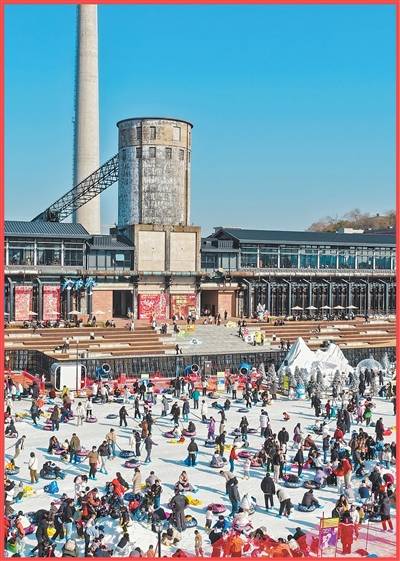浙(zhe)江省杭州市将杭钢半山钢铁(tie)基地(di)融(rong)合运河文化打造大运河杭钢公园(yuan)。图为(wei)市民游客在体(ti)验冰雪嘉年华。